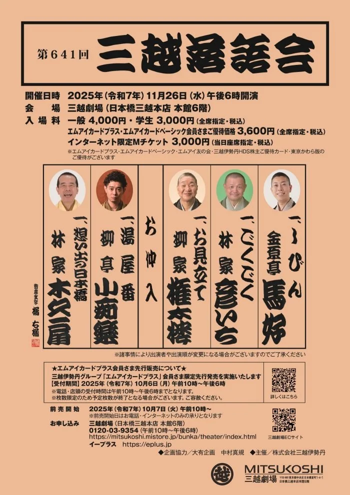 25/11/26 第641回三越落語会 日時:2025年11月26日(水) 18時開演予定会場:日本橋三越本店 本館6階 三越劇場(東京都中央区日本橋室町1-4-1)料金:一般4,000円、学生3,000円(全席指定) インターネット限定Mチケット3,000円(当日座席指定)詳細:三越ウェブサイト StaffMay 28, 2025rakugokai Facebook0 Twitter 0 Likes