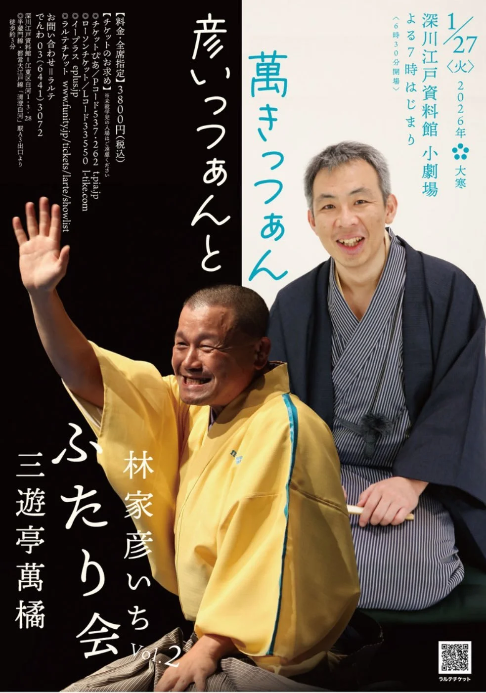 26/1/27 林家彦いち×三遊亭萬橘 ふたり会「彦いっつぁんと萬きっつぁん」 日時:2026年1月27日(火) 19時開演 ( 18時半開場 )会場:深川江戸資料館 小劇場(東京都江東区白河1-3-28)料金:全席指定3,800円チケット販売:ぴあ、eplus、ローチケお問い合わせ:ラルテ TEL 03(6441)3072 メール l-arte.mail@l-arte.co.jp StaffApril 20, 2025rakugokai Facebook0 Twitter 0 Likes