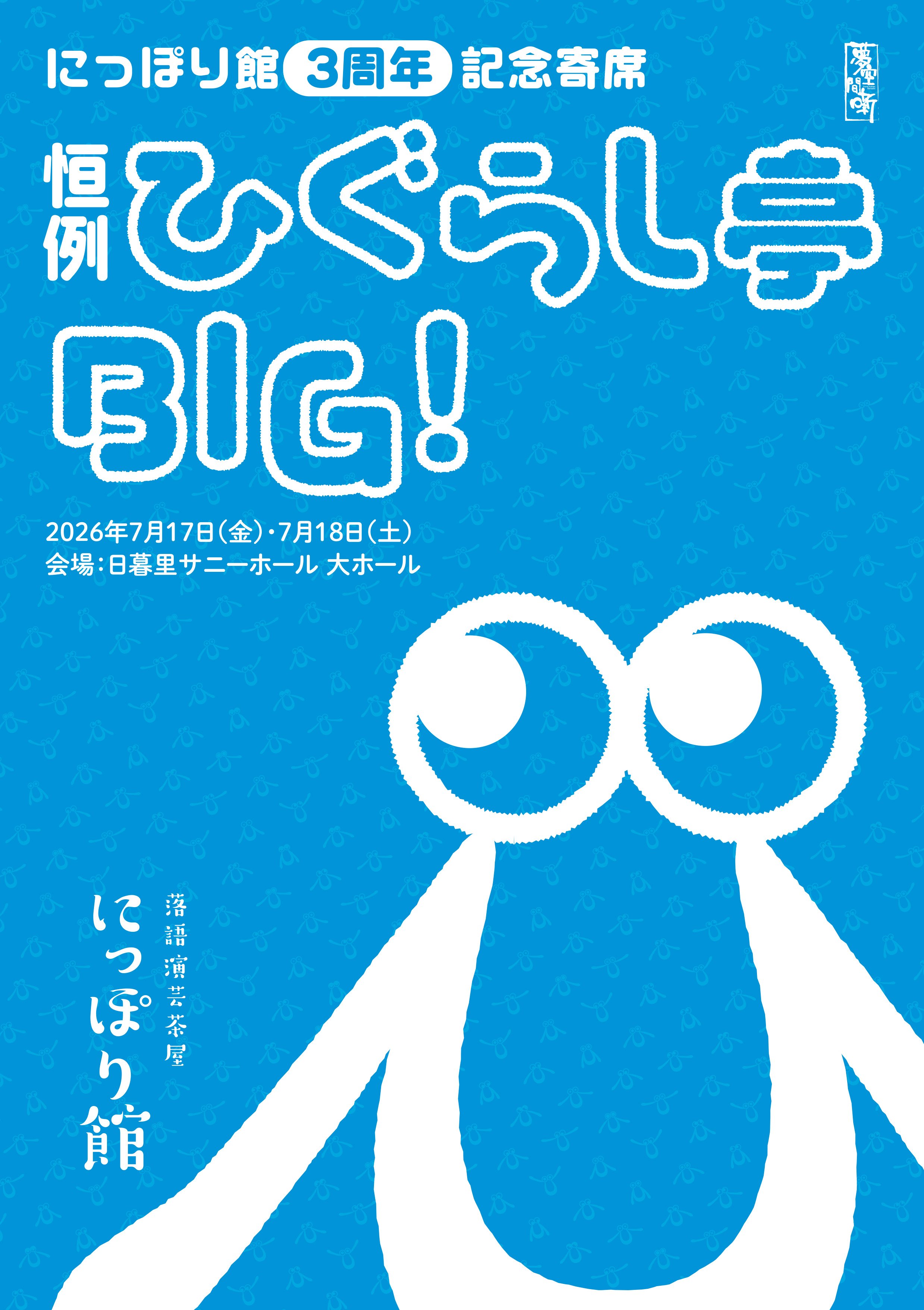 26/7/18 にっぽり館3周年記念寄席恒例ひぐらし亭BIG! 日時:2026年7月18日(土) 13時30分開演予定(30分前開場)会場:日暮里サニーホール料金:4,000円(全席指定・税込)チケット販売:ぴあ、ローソンチケット、eplus詳細:夢空間ウェブサイト Hikoichi HayashiyaFebruary 5, 2026rakugokai Facebook0 Twitter 0 Likes